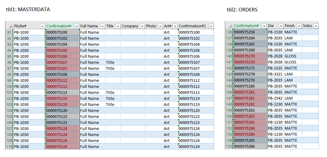 Если вам нужно дополнить таблицу MASTERDATA столбцами из таблицы ORDERS, вы могли бы применить функцию VLOOKUP. Но есть проблема: несколько записей могут иметь одинаковый номер заказа (Confirmation#). В этом случае использовать VLOOKUP будет некорректно, т.к. функция возьмет в расчет только первую запись.