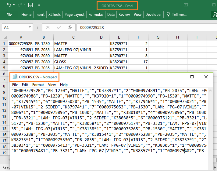 Информация о подтвержденных заказах поступает из бухгалтерской системы в формате CSV. Сложность в том, что недостаточно просто открыть файл ORDERS.CSV в Excel. Здесь мы сталкиваемся с типичной проблемой «съеденных» нулей в номерах заказов (столбец A). Поэтому данные нужно будет еще подготовить.