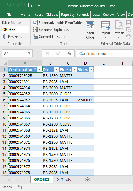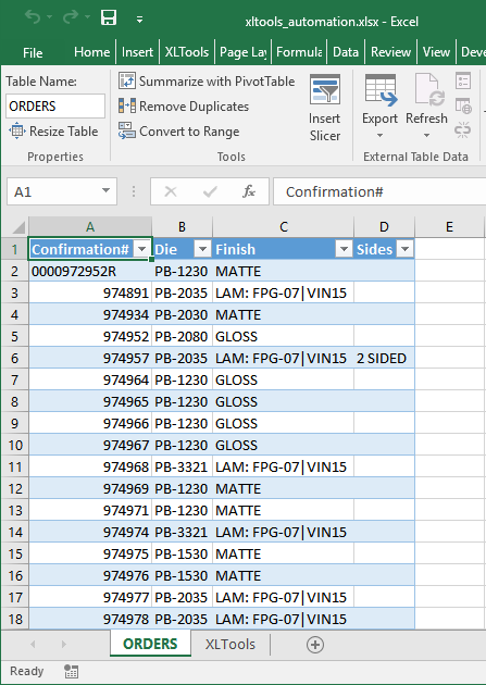 - Помещаем результат на новый скрытый лист “ORDERS”. Обратите внимание, что этот новый лист заменит тот, что был сформирован в прошлом шаге при извлечении данных командой ExtractTable.