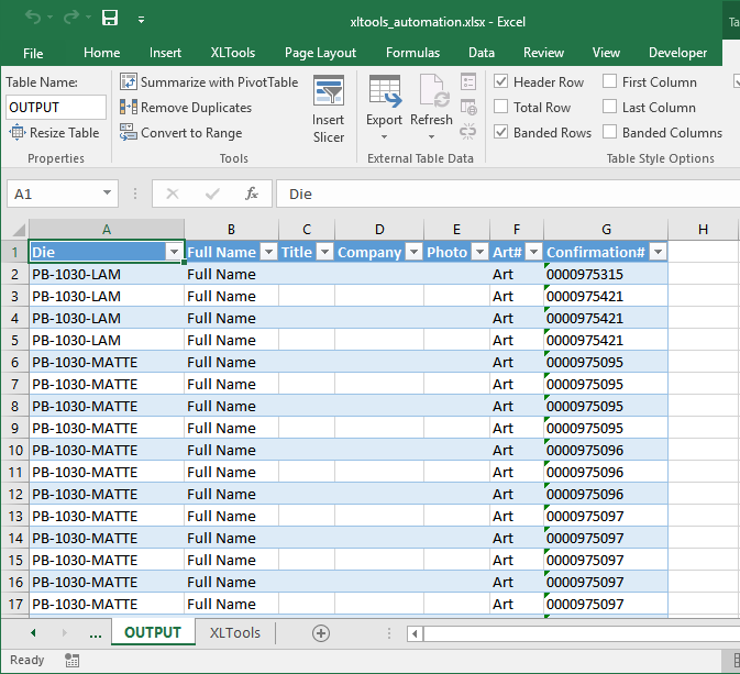 - Добавить заголовки столбцов “Confirmation#”, “Die”, “Finish”,“Sides”